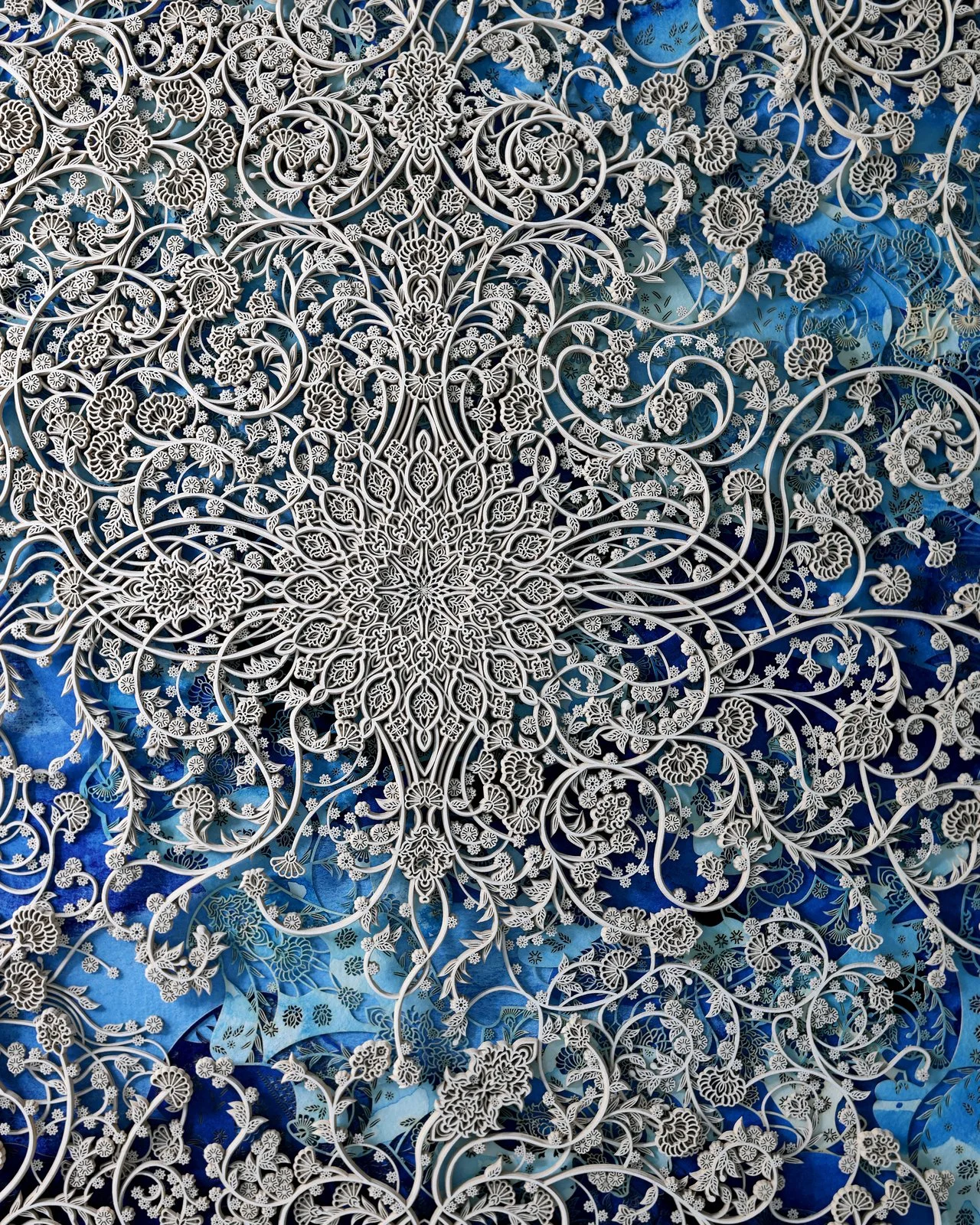 Ornamental Mixtapes is a series of works inspired by repeating ornamental motifs drawn from antique Persian carpets. I imagined the delicate tendrils of flowers and leaves growing outward, breaking away from the symmetry toward a more organic form. The pieces are hand drawn then algorithmically processed. They are cut layer by layer using a specialised laser machine with a single layer taking up to eight hours to cut. The cut paper layers are finished by hand and glued in a delicate collaging technique so that when assembled, the many motifs and tendrils appear almost carved.
